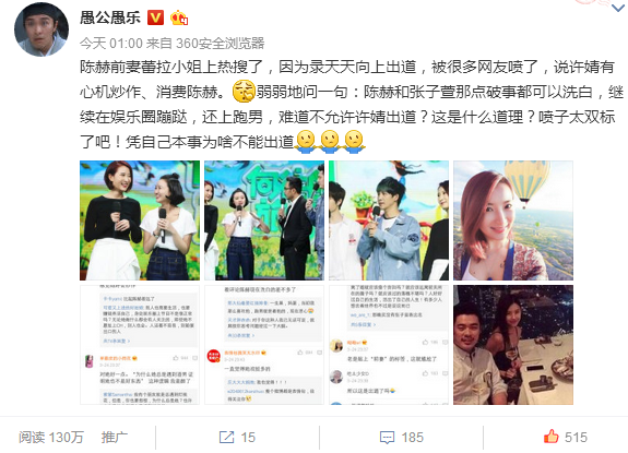陈赫前妻蕾拉小姐上热搜了,因为录天天向上出道,被很多网友喷了,说许婧有心机炒作、消费陈赫。弱弱地问一句:陈赫和张子萱那点破事都可以洗白,继续在娱乐圈蹦跶,还上跑男,难道不允许许婧出道?这是什么道理?喷子太双标了吧!凭自己本事为啥不能出道?