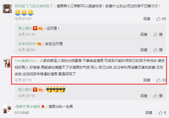 正如下面这位网友说得:人家姑娘至少活的光明磊落,不像有些渣男,可笑到只能利用自己的孩子来洗白,装他妈好男人,好爸爸再能装也掩盖不了你渣男的气质。恶心,自己出轨,反过来利用消费无辜的前妻,还攻击她,这他妈百年难遇的渣男,真是呵呵了。