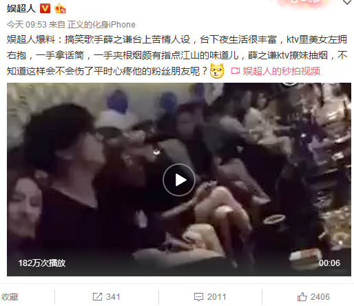 微博大号娱超人爆料说:搞笑歌手薛之谦台上苦情人设,台下夜生活很丰富,ktv里美女左拥右抱,一手拿话筒,一手夹根烟颇有指点江山的味道儿,薛之谦ktv撩妹抽烟,不知道这样会不会伤了平时心疼他的粉丝朋友呢?http://si1.go2yd.com/get-image/0C2qqVG00VU