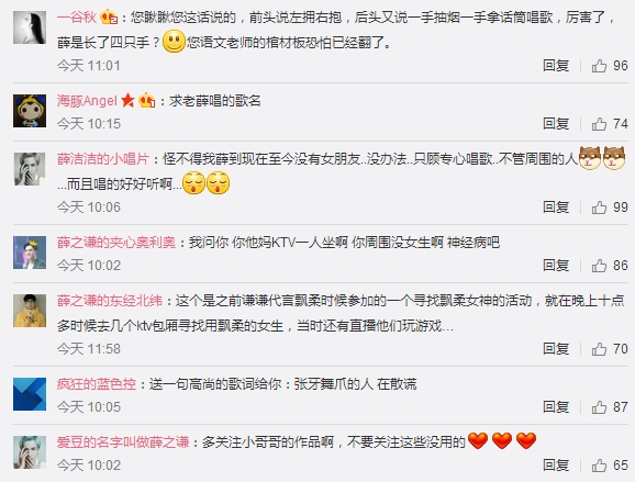 网友留言说:您瞅瞅您这话说的,前头说左拥右抱,后头又说一手抽烟一手拿话筒唱歌,厉害了,薛是长了四只手?怪不得我薛到现在至今没有女朋友,没办法,只顾专心唱歌,不管周围的人;多关注小哥哥的作品啊,不要关注这些没用的。http://si1.go2yd.com/get-image/0C2qqVlgdk0