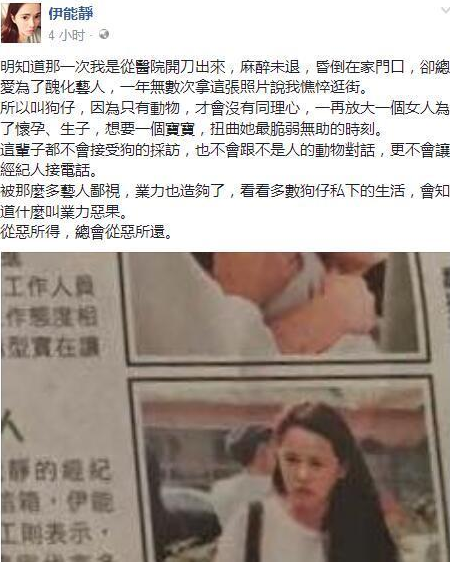 伊能静说当时刚从医院开刀出来,不仅麻醉未退,甚至昏倒在家门口,但狗仔却挑在她为了拼怀孕最无助的时刻,无数次刊登此照说是憔悴逛街。就事论事,明星被拍到丑照,一般都不太高兴,但是爆粗口就显得你情商低了点。