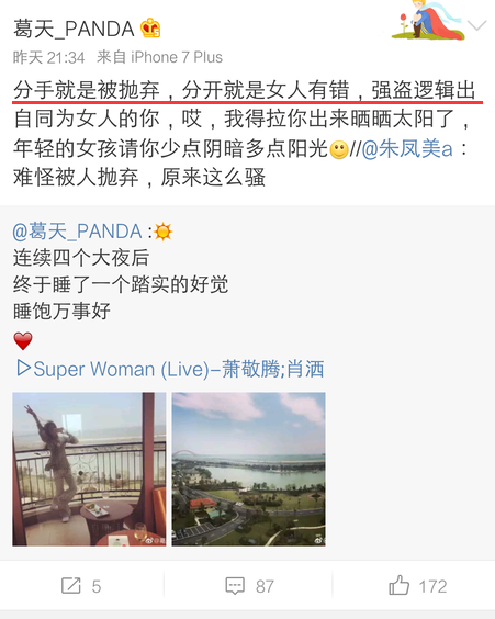 葛天在5月2日晚上9点34,转发并艾特了这个黑粉说:分手就是被抛弃,分开就是女人有错,强盗逻辑出自同为女人的你,哎,我得拉你出来晒晒太阳了,年轻的女孩请你少点阴暗多点阳光。