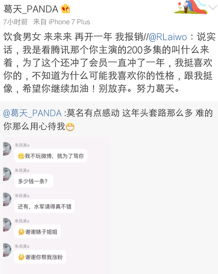 后来她还晒出了这个黑粉对她的人身攻击私信截图,对方继续讽刺葛天:我不玩微博,就为了骂你,水军请得不错,谢谢婊子姐姐。葛天回应说:莫名有点感动,这年头套路那么多,难的你那么用心待我。http://si1.go2yd.com/get-image/0D4XX9cDcki