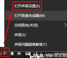 1.依旧打开声音设置页面。对着电脑音量图标单击右键,再左键选择单击“打开声音设置”。