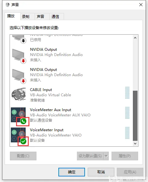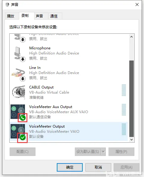 (操作方式:对着“VoiceMeeter Aux Output”单击右键,在左键单击“设置为默认通讯设备”。)