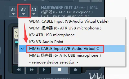 1.如上图,打开VB之后,在右上角点击A1,将A1输出设备设置为MME开头+后面是你常用设备名。