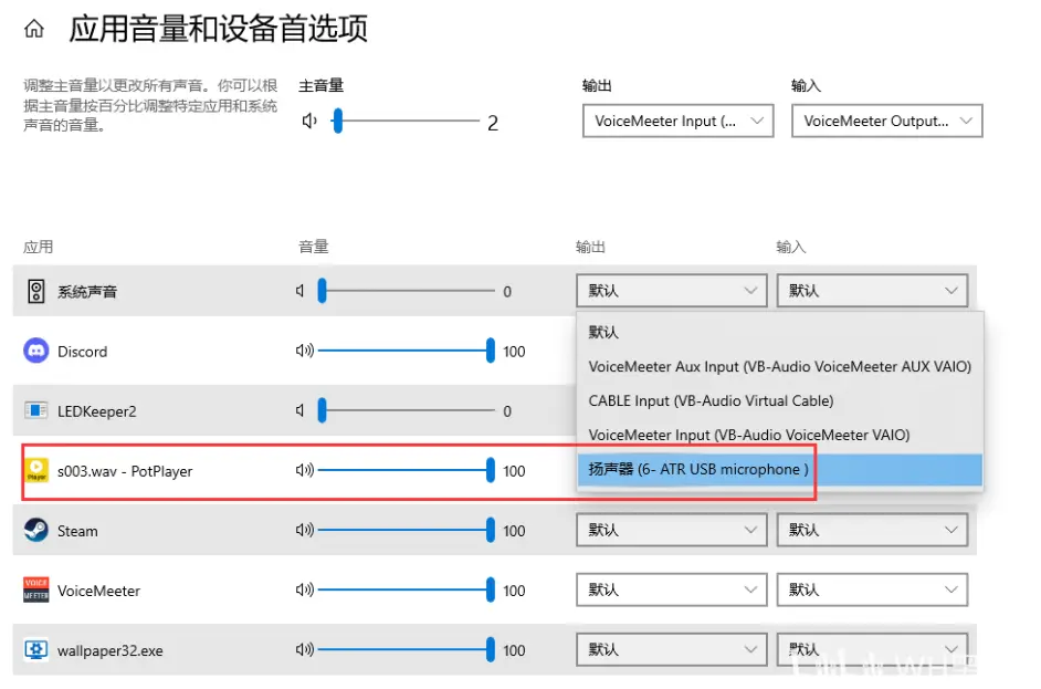 例:我原本默认使用输出设备叫做“扬声器(6-ATR USB microphone)”,所以这里应该选择“MME: 扬声器(6-ATR