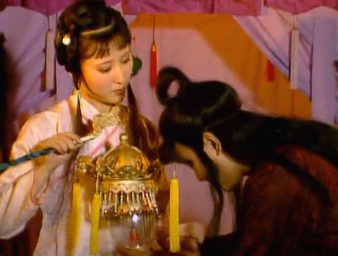 渔翁打扮的宝玉刚进门就忙问黛玉今天好点了没,吃的好不好,睡得好不好,还举着灯看了看黛玉的气色。