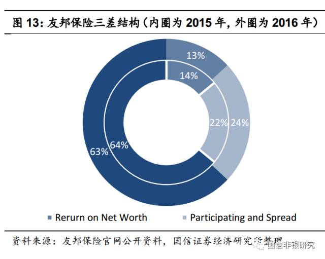 友邦保险的高估值反应了其具备优势的保障业务。在我们构建的估值模型中,EV增速和死差费差占比是影响寿险公司估值最为核心的两个因素,而友邦在这两点均具备优势,前者为行业性因素,后者为友邦超强“个性”所决定。对于前者而言,正如友邦保险首席执行官在年报中屡次强调的“我曾多次强调友邦保险享有极佳的优势,得以受惠于亚洲重大的长期经济及人口结构增长动力。区内市场对医疗护理、保障及储蓄产品广大和持续的需要,可以抵御周期性经济波动”;后者如友邦保险领先行业的新业务价值率以及死差和费差占比,这也是友邦保险估值领先国内上市险企估值的原因。