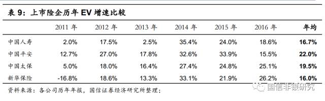 1)自2011年以来,四家上市险企EV年均增速范围为16.0%-22.0%,保守起见,我们假定未来EV年增速为16%;