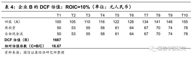 企业A的估值为2500元,相对估值倍数为25倍;企业B估值为1667元,相对估值倍数为16.67倍。通过对比可知,在同样的业绩实现情况之下,企业A每年用于再投资的资本更少,也即具有更高的投入资本回报率(ROIC)和更多的自由现金流,其评估价值也高于企业B。
