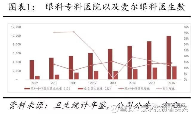 医生是医疗服务行业最为稀缺,也是最为核心的资源,而爱尔已经通过自身生态体系的不断完善,将医生资源牢牢把握在手中,这也现在及未来爱尔的核心壁垒所在。从存量市场来看,目前我国眼科医生约30000名左右,整个爱尔体系的眼科医生数量超过3000名,约占全国眼科医生数量的8-10%。根据我国卫生统计年鉴的数据,截止2016年眼科专科医院的执业(助理)医师数量为9932名,同比增长14.15%,2009-2016年年复合增速为12.32%。爱尔目前获取医生的主要途径为(1)、从现有医疗体系中获取医生,主要为公立医院;(2)、自我培养。