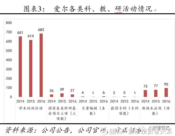 公立医院目前是爱尔获取医生资源的最主要途径,爱尔与公立医院相比,在激励机制、晋升体系、科研支持等多个方面都有较大的优势。激励机制与公立医院相比,1、更加阳光化;2、工资薪酬处于行业中上游水平;3、中长期有股权激励以及合伙人计划来大幅提高骨干成员的忠诚度以及收入水平。晋升体系与公立医院相比,1、更大的发展空间:公立医院经常出现论资排辈或者编制问题,一些由于各种公立体制限制,而无法升职的优秀医生,可以在爱尔得到进一步地位的提升;2、业务上更多的锻炼,尤其是手术的机会:爱尔的眼科病人资源集中,眼科病人数量具有明显优势,公立医院医生通常需要多年等待也不一定有足够的手术机会,而在爱尔,由于病人资源集中,年轻医生会有更多更早的机会接触更多的病人,提升自身技能;科研支持方面,爱尔明显优于国内大部分公立医院,不亚于目前国内顶尖的公立医院:2016年开展学术培训活动682场,国家各类科研基金项目立项、结题27项,编制专著5本;同时,公司作为眼科专科医院,拥有亚学科更为细分的优势特点,给予了医生进一步加强在各自细分领域优势的机会。