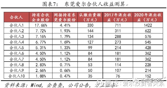 以此次定增收购的东莞爱尔为例,东莞爱尔成立于2014年8月,合伙人通过合伙企业持有东莞爱尔25%的股份。假设东莞爱尔2017年净利润为1074万元(2017H净利润为537万元,假设全年为半年度两倍),2017年后收入以每年20%增长,净利率为20%;并假设合伙人在当年以15倍PE退出。若合伙人在2017年退出,合伙人平均可获收益246万元,约为平均出资额的2.16倍,若合伙人在2020年退出,此时东莞爱尔预计净利润为2148万元,合伙人可获得出资额4.31倍的收益。
