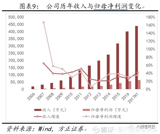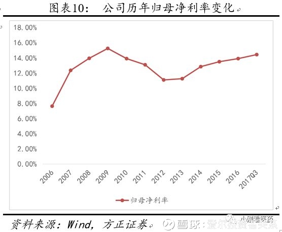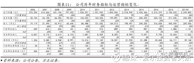 公司收入从2006年的1.91亿元,上升至2016年底的40.00亿元,年复合增速达到了35.54%,2017年前三季度实现收入43.82亿元,同比增长42.16%;归母净利润增速更为亮眼,爱尔的归母净利润规模从2006年的1459万元,上升至2016年的5.57亿元,年复合增速达到了43.95%,2017年前三季度实现归母净利润6.33亿元,同比增长35.06%。公司归母净利率伴随扩建医院不断成熟,也呈现稳步上升的态势,2017年前三季度归母净利率达到了14.44%。门诊量今年有望突破400万人次,手术量有望突破40万例,门诊与手术单价持续提升。
