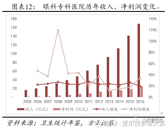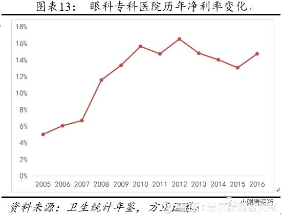 根据卫生统计年鉴,眼科专科医院2016年收入规模为168亿元,同比增长19.27%;净利润为25亿元,同比增长34.55%,净利率在15%左右。全国医院端整体2016年收入规模为25,784亿元,同比增长12.70%,眼科专科医院收入占比仅为0.65%。