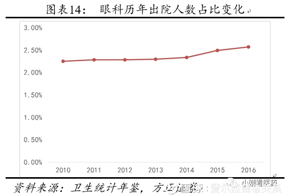 由于统计年鉴没有眼科分学科的收入统计,因此我们选取了两个不同的指标进行推算。在卫生统计年鉴中,单独有眼科分类的为出院人数构成以及门急诊构成。2016年眼科在出院人数这一类别的占比为2.57%,在门急诊构成中占比为3.02%,因此对应这一比例推算2016年眼科医院端市场规模分别为663亿元和779亿元,当年增速分别为16.22%和13.83%。2016年爱尔眼科收入为40亿元,对应市场占有率仅为6.03%和5.13%,仍有很大的市场空间。