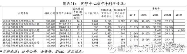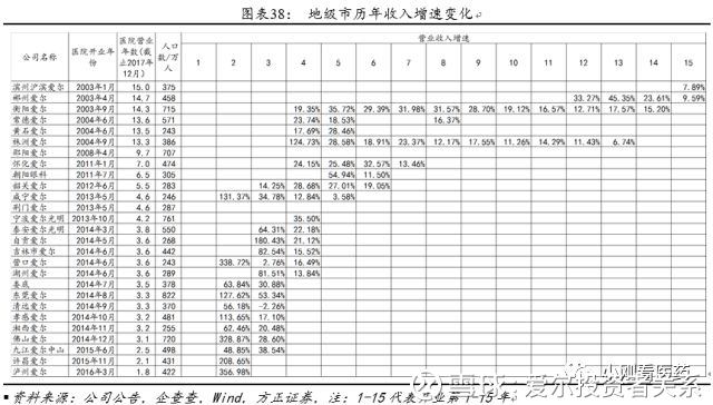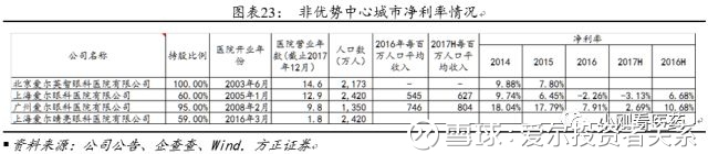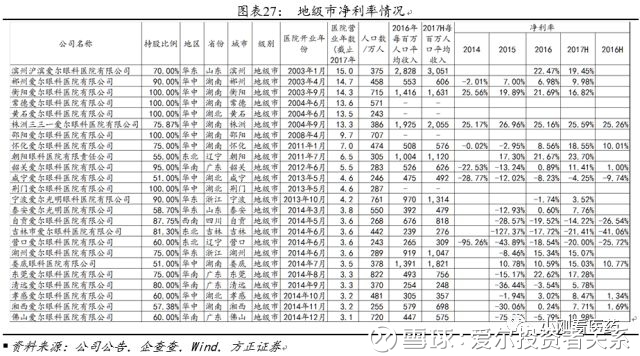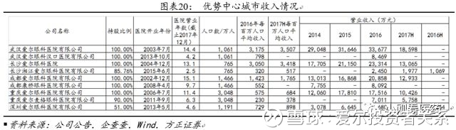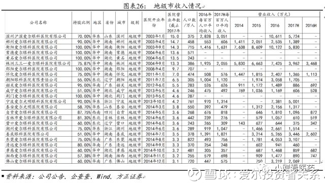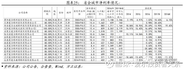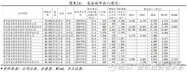 同时,我们对爱尔有公告中公布财务数据的医院进行了统计,根据城市类别进行了分类。数据使用标准及细节处理方式如下:医院开业年份数据由于公司没有具体公布每家医院的开业时间,因此我们使用工商注册时间的数据进行统计;主要关注的指标是每百万人口收入以及净利率,2017H的收入为半年度收入数据乘以2作为全年预估数据,以方便与2016年数据进行比较;各数值都设置悲观、中性及乐观假设,以方便投资者进行情景与敏感性分析。