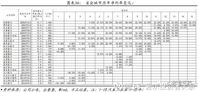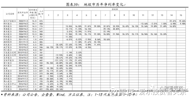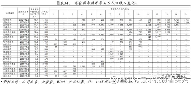 在数据处理方面,因为在预测业绩时,我们需要考虑到各地医院设立时间不同所带来的收入与净利率的变化,所以我们对历年的财务数据进行了调整:我们将财务数据的统计形式从不同的年份转化为了开业的时间周期,后续图表中的1-15的数字表示开业的第X年;而由于人口数据每年的变化幅度较小,为了减少数据处理的复杂程度以及考虑到数据的可及性,我们与之前使用的人口数据保持一致,对省会城市的人口数据统一使用2016年的常住人口数据,地级市统一使用2010的常住人口数据,县级市统一使用2013年户籍人口数据,需注意这里的人口数据仍然存在重复计算的问题。