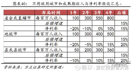 由于目前县级市没有历史财务数据,我们结合地级市和调研数据的情况,将每百万人收入第1-4年设为为50、200、300、360,后续以15%的增速增长;考虑到县级市运营成本较低,净利率第1-4年分别为-10%、0、10% 和15%,后续保持20%的水平(县级市没有历史数据作为假设的参考依据,可能会存在不合理性)。