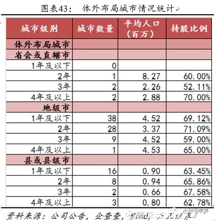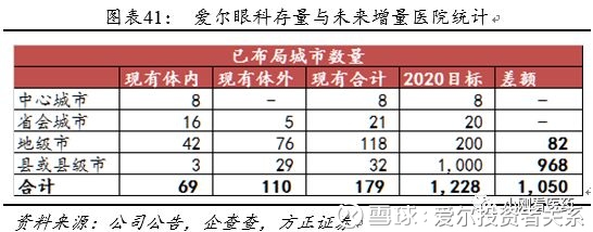 在完成非重点城市医院的假设后,我们需要根据公司2020年的目标与现有的存量医院进行比较,来搭建未来5年的模型。因此,我们首先对医院的数量情况进行了统计:从工商数据(来源:企查查)能够获取的信息来看,爱尔已经在179个城市进行了布局,上市公司体内布局69个城市,体外布局110个城市,详细情况列举如下。