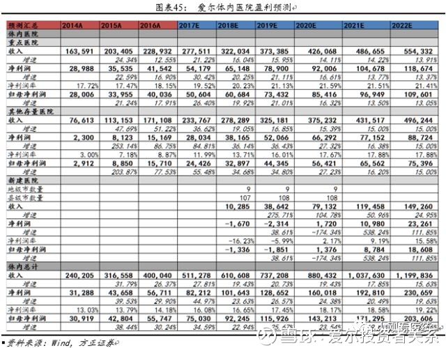 对于重点城市医院,我们则直接根据历史数据进行了预测,主要预测指标为收入增速和净利率。数据处理细节如下:在测算时,如果遇到一个城市存在多家医院的情况时,为了便于我们用每百万人口指标判断合理性,我们将其进行合并计算,不做单独预测(对应的预测行标为灰色);存在公司部分年份未公告情况时,我们会进行手动调整,与预测数据一致,统一用蓝色表示。详细的假设以及结果列举如下。