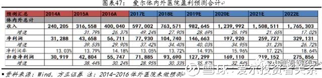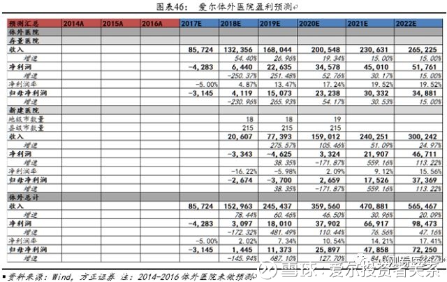 结合我们上述的测算以及公司历年来优异的经营表现,我们认为爱尔仍然处于高速成长期,远远没有达到自身及行业的天花板;同时,我们未考虑公司已经在海外参与和并购的美国、香港、西班牙80余家医院,未考虑除了公司2020年计划之外仍有100余个地级市、1000余个县级市的空白市场等待公司进入。在合理且谨慎的假设下,我们预计公司内生增长能够在未来5年稳定保持在复合20%以上的水平,并且在不需要大量对外融资的前提下并购体外眼科医院,实现未来3-5年复合30%以上的增长速度。(本测算仅为根据历史数据,理论上可以达到的结果,不代表上市公司未来5年业绩一定会达到这样的规模和增长率)