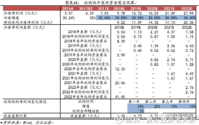 我们以2017年归母净利润实现35%增长,达到7.53亿元为基准,假设爱尔未来5年每年增长30%,获得2018-2022归母净利润分别为9.78亿元、12.72亿元、16.53亿元、21.49亿元和27.94亿元;同期根据我们的模型测算,体内归母净利润分别为9.22亿元、11.59亿元、14.32亿元、17.13亿元和20.36亿元。下表中我们列举了每年对应的归母净利润差额;我们假设公司归母净利润为公司每年收到的现金可以用作并购(公司实际历年经营现金流均大于归母净利润,我们预计主要原因为固定资产摊销拉低了净利润规模);然后我们假设公司以15倍的PE对这部分净利润进行收购,收购后记为体内归母净利润抵消对应差额;同时,收购后第1-4年,我们假设净利润增速分别为30%、20%、15%、15%。在这样的假设测算下我们可以看出,公司直到2022年才出现一定程度资金缺口,需要外部融资(本测算仅为根据历史数据,理论上可以达到的结果,不代表上市公司未来5年业绩一定会达到这样的规模和增长率)。