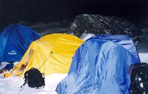 突击营地搭建在海拔4600米的一个台地上。虽说攀登的难度不是很大,但明天的登顶还是让大家都有些兴奋与紧张。晚饭后,狂风席卷而来,疲惫的队员们个个昏昏欲睡,于是,大家都拉上帐篷门链钻进睡袋去呜呼哀哉了。