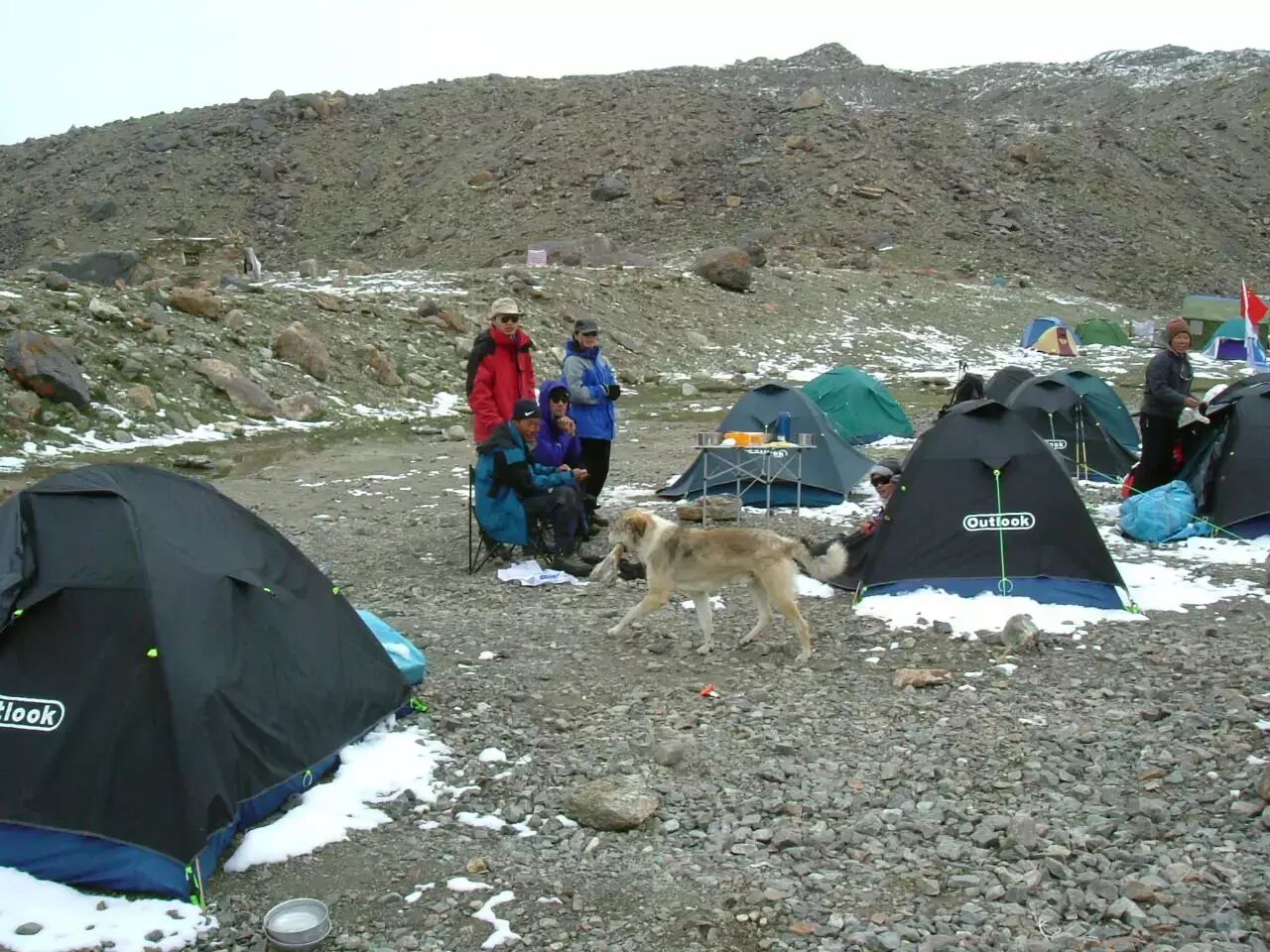 早晨,天空中飘散着碎雪,大本营营地旁的小溪已经结冰,帐篷周围不时有来回飞动着觅食的乌鸦。登山的人多了,垃圾堆里扔弃了许多可食的垃圾,就连山下村民的狗都喜欢跟主人上大本营来,主人来是找搬运的活计,狗则是幸福地来找喜爱的骨头的。