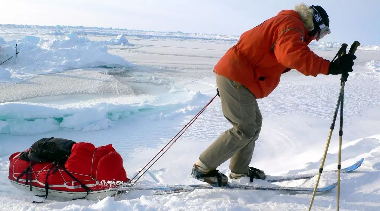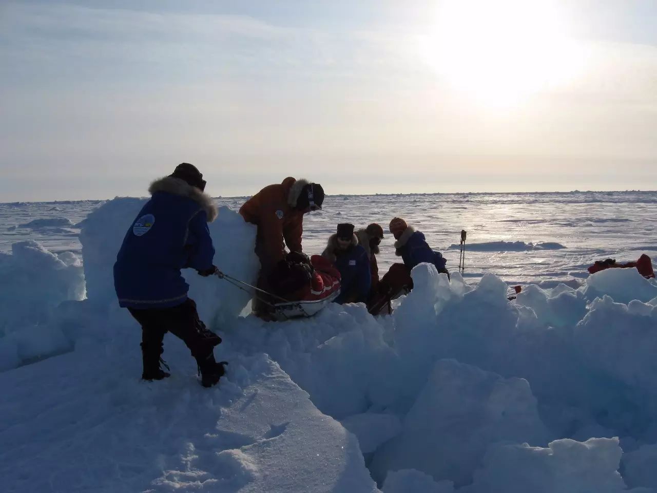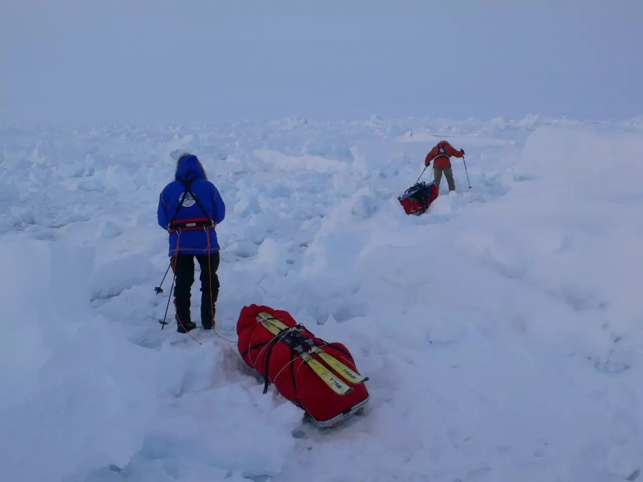 行走中看不到很远,周围总有起伏的冰丘遮挡住视线,更要提心吊胆警惕脚下随时出现的冰裂缝。冰面起伏不平,摔跤是很常见的,队员摔,领队也摔。我们几个人一路上经常摔成各种形状和冰面亲密接触,有时也会掉进松软的雪洞。连续的几个跟头我的滑雪板都摔坏了,还好领队带着备用的。有时要过一个大冰波,冰坎,因为雪橇太重,拖得筋疲力尽的时候突然觉得肩膀一轻,回头看是后面的队员在帮忙推,当前面的队员遇到问题时,我也及时伸出援手。如果没有队员之间的互相协助,真的很难想象该怎么样才能到达极点。