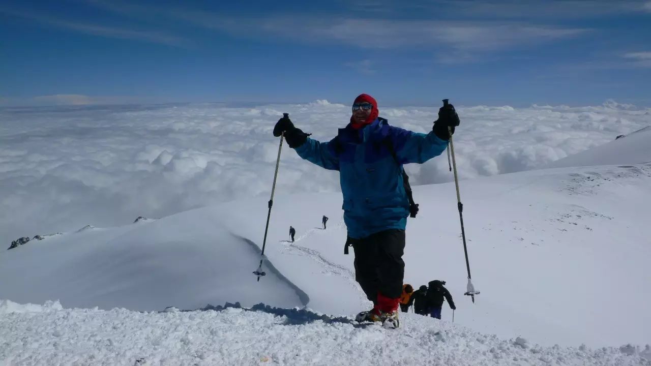 好在遇到的是中等强度的雪崩,几名队友也先后从70多公分的雪里爬了出来,幸免于难。后面的队伍见此情景纷纷下撤,我们的领队也在征求大家意见的同时,劝阻队员放弃登顶。15人中,多数已经表示放弃,就我和另外5名队友坚持要冲顶。女领队看我们心意已决,就嘱咐我们小心并说在大本营等我们,然后带着其他队员下撤了。为了赶在天黑前下撤,惊魂未定的我们6个人又继续向上。临近顶峰的一段路很窄,只有3米左右,几人排成一列,怀着激动的心情一步步接近最高点。就在我们6人踏足顶峰的那个时刻,所有人都不约而同激动地拥抱在了一起,庆祝这用生命换来的胜利。我们互相拍照留念,记录下登山生涯中最令人难忘的一个顶峰!