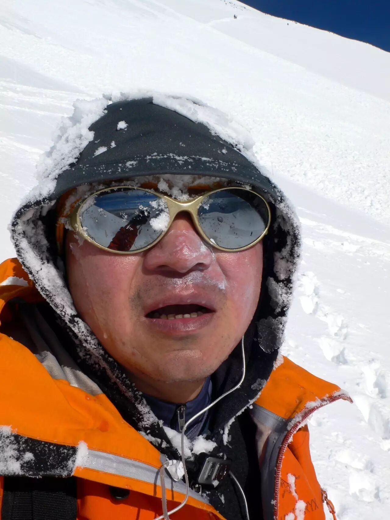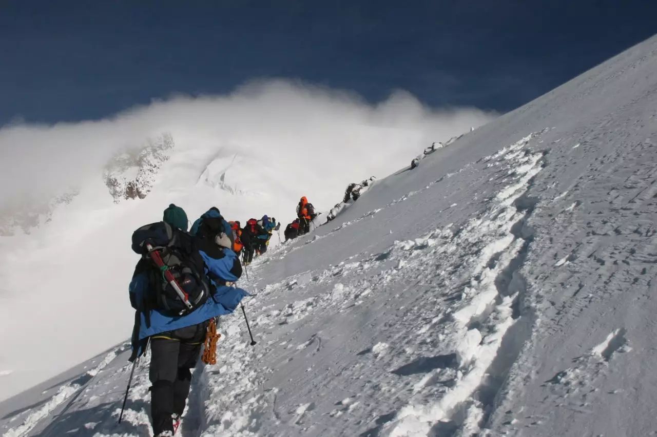 天亮的时候,我发现攀登的高度已经穿过云层,四周一片雪白,景色非常壮观。到了5000米以上,坡度越来越陡峭,队伍也逐渐拉开了距离,有的队员由于体力不支放弃了登顶。临近中午,攀升到海拔5300米时,两名女领队开始检查队员装备,并鼓励落后的队员加快攀登速度,从她们的表情可以看出这是事故多发地段。这时突然听到后面的队伍发出一阵惊叫声,我抬头一看发现一块巨大的雪墙扑面而来,还没反应过来就被卷入了其中,这才猛然意识到是遭遇雪崩了!仅仅几秒钟的功夫就被雪崩冲下60多米,我们一共8个人被冲到一块相对平缓的地面才停了下来。