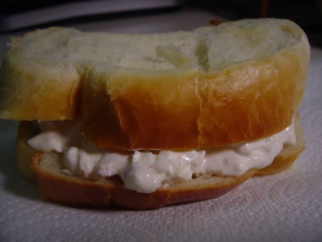 我把方子加倍,用来和上面的酸奶油吐司一起做了三明治。那么多好东西在里面,味道当然没话讲。那几滴辣酱千万不能不放,是使其不腻的点睛之笔。这虾仁酱和这绵软的吐司面包配在一起口感没话说。