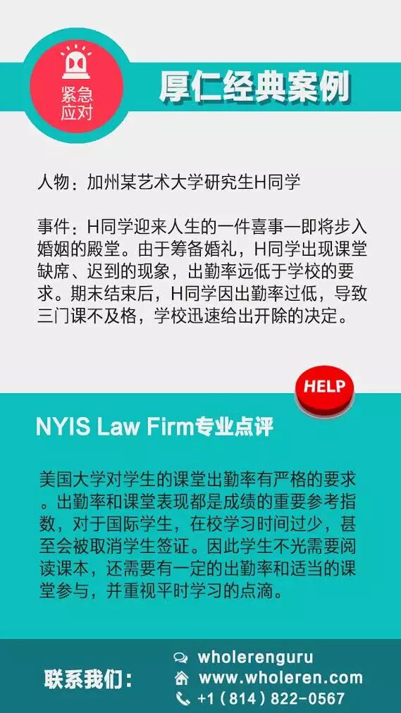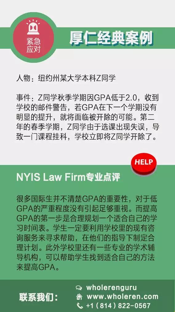 http://mmbiz.qpic.cn/mmbiz/e15U2FzG1WiaGCSFZBPSnOqygqpC3exDPspM4icw4VqN3B6oUibW5HaY0QJAEH5u9MJT1zZeCjfNo7SBFx1BXjhPw/0?wx_fmt=jpeg 你以为多翘几节课,考试瞄同桌一眼,作业懒得做拿学霸的去交差就可以悠闲的混过美国大学生活,然后顺利拿到文凭吗?不要太天真,这些小计谋逃不过教授们的法眼。一旦被发现,后果很严重!侥幸的心理是,被发现大不了得零分,下次重新上不就行了。非也!如果触犯了学校的规章制度,有些时候,可能直接面临被开除。美国的大学并不会因为你的眼泪或者别的东西就改变做出的决定,制度面签,人人平等。为了减少不必要的麻烦,希望大家警钟长鸣! 厚仁教育收到了很多留学生在美国“惹事”后的求助,小纽来为大家支支招! 学业篇 在美国,所有学生都应该重视出勤率,按时交作业,诚信,GPA,上课的参与度。教授在学期末会根据学生每一项的表现给出最终的分数,而不是只要期中期末考好了就可以高枕无忧。可偏偏很多小伙伴没有意识到这一点,结果吃了大亏。。。下面这些情况你遇到吗?你身边的朋友遇到过吗?1. 没有重视GPA 被开除