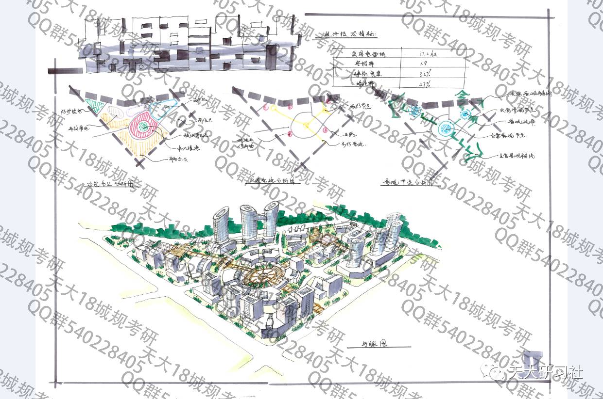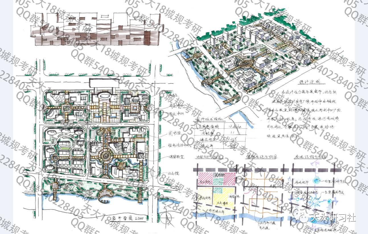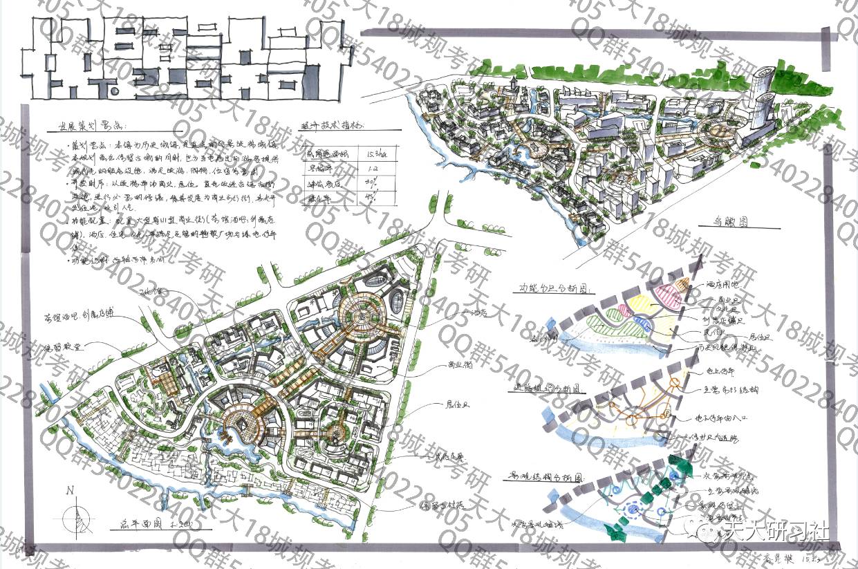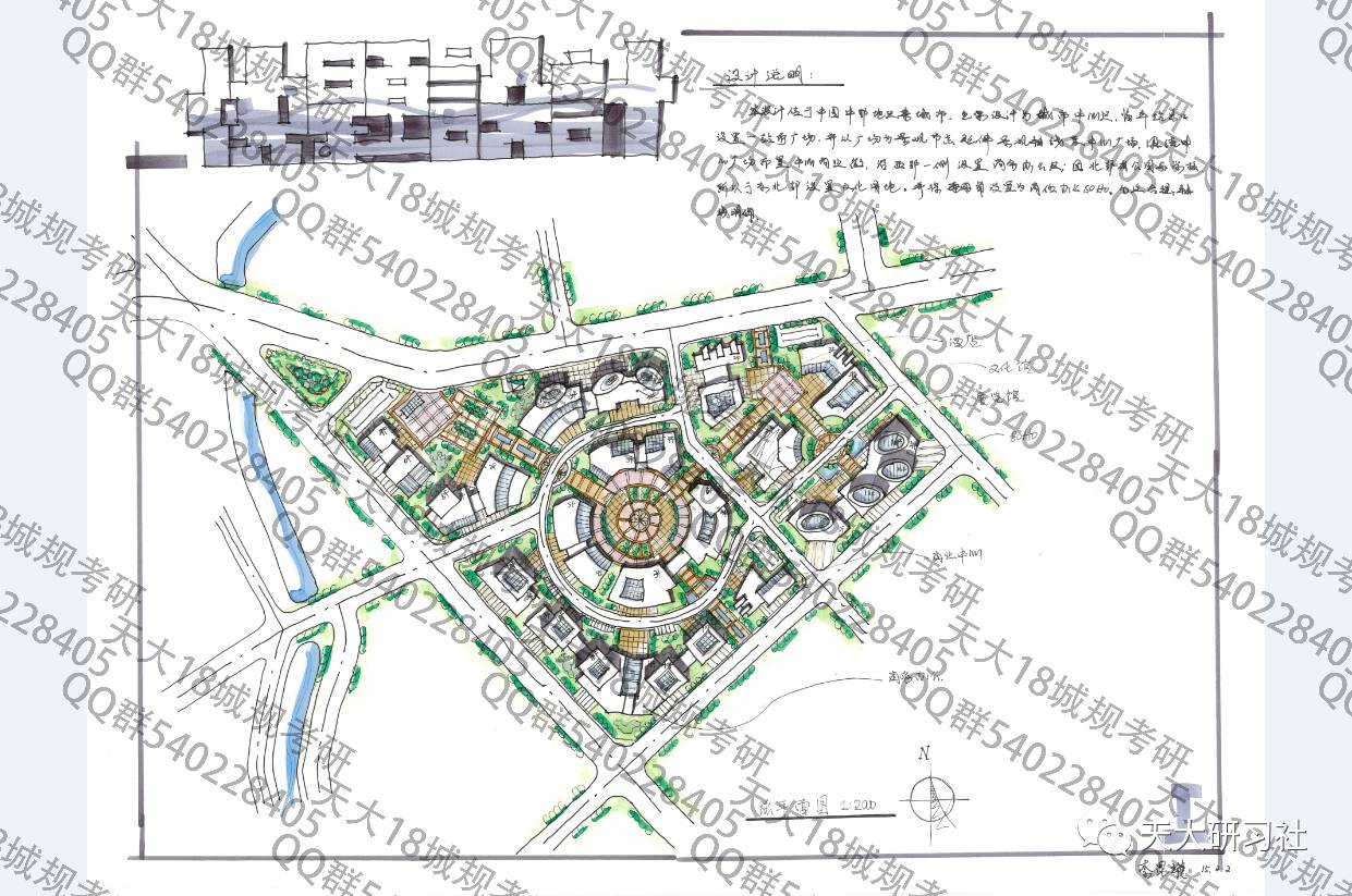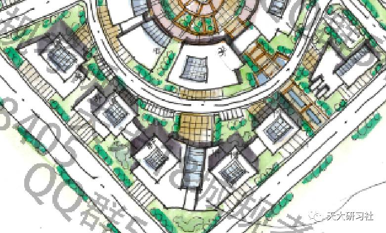 今天来跟大家分享下16年天大城规快题最高分138的李学姐的部分快题练习作品。李学姐的风格独特,辨识度高。其中较小的街区尺度、较高的路网密度、清晰明了的空间结构、对圆形空间要素的执着使用是她快题的一大特色。同时画面用色清淡,画面的对比与方案的图底关系又一目了然,成为大家争相学习临摹的对象。