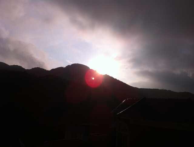 5点35分,太阳开始露出她的笑脸。两分钟后,整个红彤彤的、圆圆的、大大的火球出现在大伙的面前。这时,我环顾四周,整个天边都红了起来,组成一个特大的粉红色的圆圈,把所有的山峰围在其中,美丽极啦!我们把日出的全过程定格下来,心中不禁油然而生:真是棒极了,这一趟没白来呀!