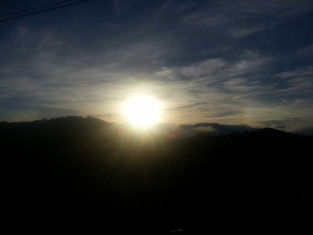 当驾骑离开度假村还不到10分钟的路程,左侧天空出现了日出前壮丽的朝霞。儿子立刻把车停在路边,我们迎着朝霞,眺望四周,在晨曦的映照下,眼前的山峰此起彼伏,隐隐约约地出现在晨雾中,