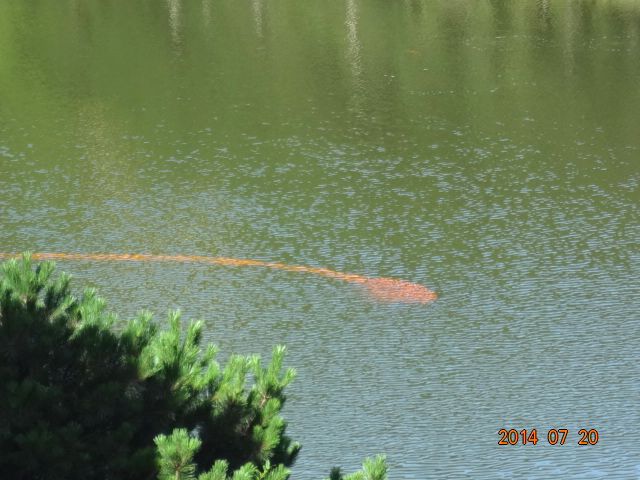 我们依栏看山下的湖面,只见红色的鱼群分成两个群体,分别在“头领”的引领下,时而成蛇形,时而成园形,时合时分地进行游弋,形成各种美丽图面,我把这难得一见的精彩画面定格下来,感到非常的高兴!