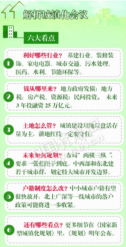 中央城镇化工作会议提出了推进城镇化的六大主要任务,勾画出新型城镇化的清晰蓝图。新型城镇化重在提高发展质量,放弃粗放扩张的土地城镇化路径,推进以人为核心的新型发展路径。城镇化发展方向确定后,所需要的钱从哪儿来?
