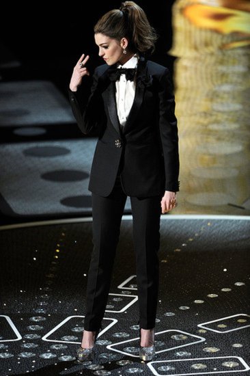在和此次奥斯卡颁奖典礼的另一位男主持休·杰克曼表演舞台剧时,安妮穿着了一套修身款的黑色西装,反转性别的演出让人惊叹,这套黑色西装和她的发型给人留下了极为深刻的印象。脚上的一双镶嵌了施华洛世奇水晶的高跟鞋,也着实闪到了众多观众的眼镜