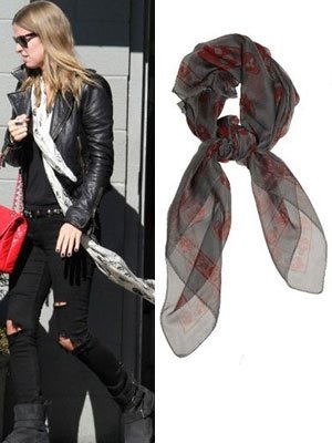 尼基-希尔顿的这身打扮太酷了,黑色皮衣+黑色破洞裤,红色的CHANEL和Alexander McQueen的黑白骷髅头围巾搭配的恰到好处。