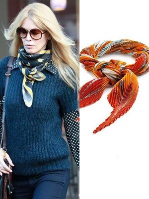 辛迪-克劳馥也是围巾达人,各种图案的围巾数不胜数,而且搭配的很到位。这件深青色的短袖毛衣和波点衬衫,脖子上加上一款黄黑色的郁金香图案丝巾,一下子出彩很多。