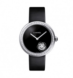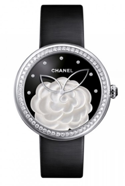 “Mademoiselle Privé”系列腕表,Camellia珍珠母贝山茶花表盘18K白金表壳镶嵌60颗明亮式切割钻石(1克拉)。缟玛瑙表盘上饰以珍珠母贝雕刻而成的山茶花,镶嵌7颗钻石时标。防反光处理蓝宝石水晶镜面。蛋面切割缟玛瑙表冠。黑色缎面表带。针式表扣镶嵌80颗明亮式切割钻石(0.4克拉)。高精准石英机芯。