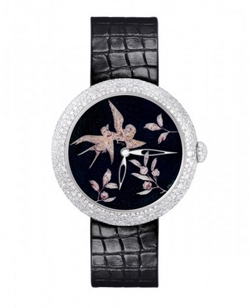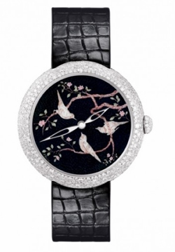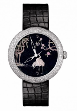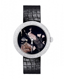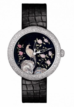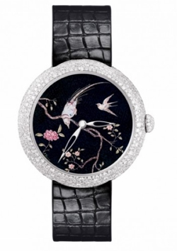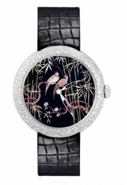 Coromandel东方屏风表盘独一无二表款,瑞士手工制造。18K白金表壳,669颗雪花式镶嵌钻石(3.1克拉),以日内瓦传统的大明火珐琅工艺烧制成的表盘上,描绘有精美的微绘图案。