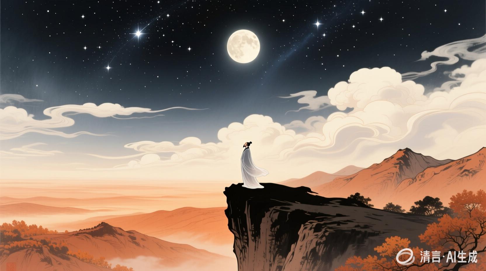 一幅杰作,结合中国水墨画风与现代幻想艺术。一片壮丽辽阔的天空主宰着画面。天空上部是充满璀璨星辰和柔和月光的深邃宇宙夜空。下部是白昼天空,飘浮着空灵的流云。昼夜天空无缝融合。下方,是温暖的赭石色和橙色调的宁静秋日山脉,在天际线下形成剪影。一个微小、半透明的学者身影站在悬崖上,仰望着天空,他的形态与云彩融为一体。氛围如梦似幻,宁静而充满灵性。史诗级规模,电影感光效,高细节。
