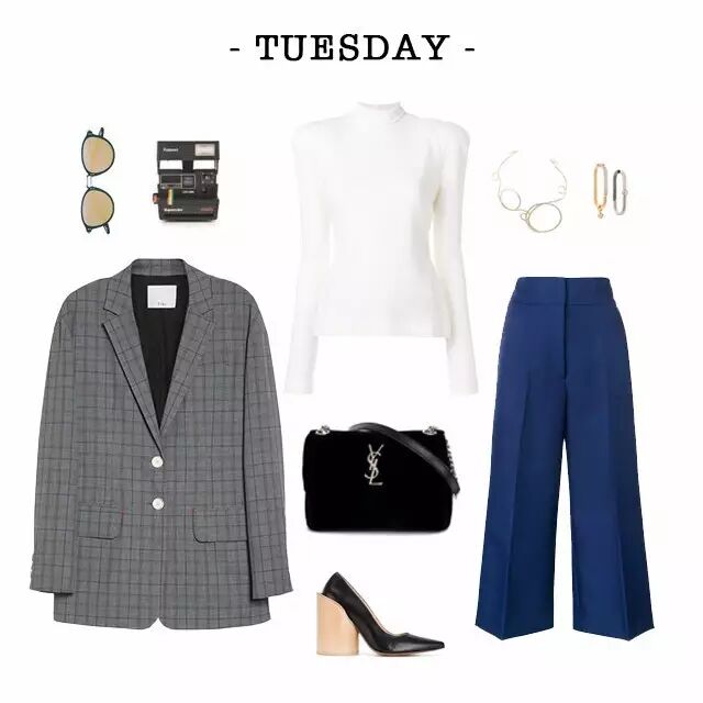 我们这次以威尔士亲王格纹西装外套为主要单品,用广大女性衣橱里都会有的必备衣服,搭配从周一到周五,五天不重复的造型。