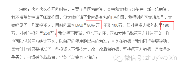 好吧,数据骗骗媒体也没什么大不了的,之前看到投资人爆料的大姨吗数据才惊呆了。大姨吗为了对外融资,对投资人说谎,90万的日活用户敢报到190万。要知道,投资人对创业者的最基本要求就是诚信,其次才是能力。企业要想获得投资人青睐,只有踏踏实实地将产品做好、把用户体验做好,在市场竞争中胜出才是唯一的正途。否则,一个企业依靠不正当手段来赢得投资者的关注甚至同情的话,根本不值得投资人投资。如今谎报一倍的数据,年底再融资日活不知该报多少,真替大姨吗捉急。