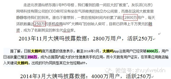 我找到了之前大姨吗的一篇文章《柴可:布局“大姨吗”的“大平台”》,柴可在文章里面说“截止2013 年11月份,一款诞生不到两年的APP——大姨吗,已经创造了累计下载次数过亿人次,注册用户超过2800万人,每日活跃用户数达250万人的骄人成绩。”在另一篇文章里面说“截至2014年3月,大姨吗APP注册用户突破4000万,用户日活跃量已增至250万。”四个月的时间里面,他们的注册用户剧增了1200万,而日活跃用户数却保持不变,一直维持250万。看完这两篇新闻,不免怀疑,新增的1200万用户难道都是僵尸粉?