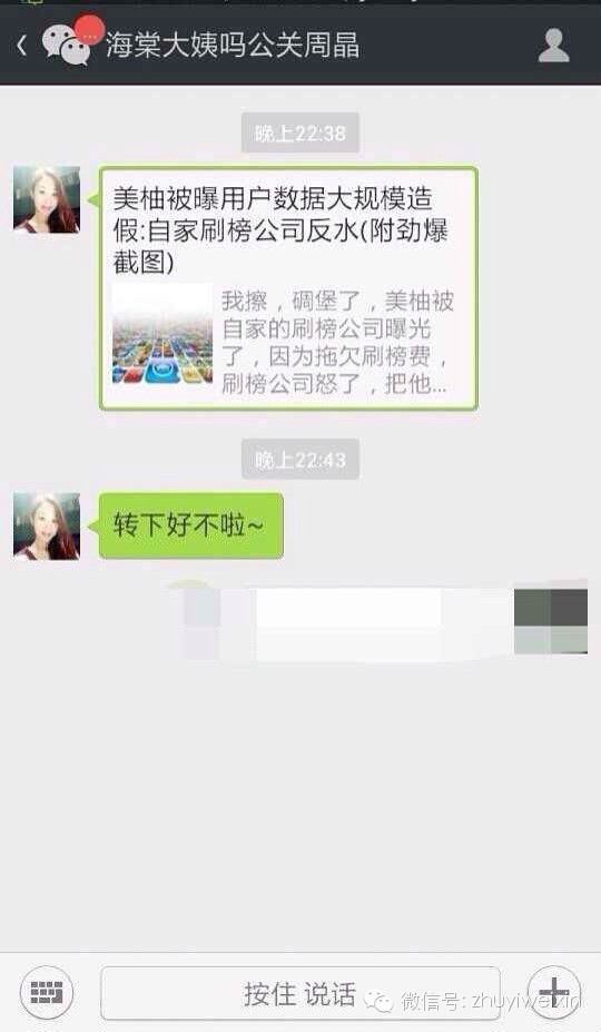 要说大姨吗公关的反应速度,那真的是一流,艾瑞数据一出,三个小时候后就马上发布了一篇混淆视听的文章。乍一看可以忽悠到不少圈外人,但是明眼人一看就知道是篇公关稿:文章标题和下面对话基本对不上号,典型标题党。不知道是公关的同学故意的,还是不懂Push推广和刷榜不是一码事儿,弄得完全混淆了概念。然后找了个爆料的借口——欠钱反水,你把人家小哥看的也太没有气度了吧?其实下面这张图放出来,大家就知道这篇文章怎么出来的了。